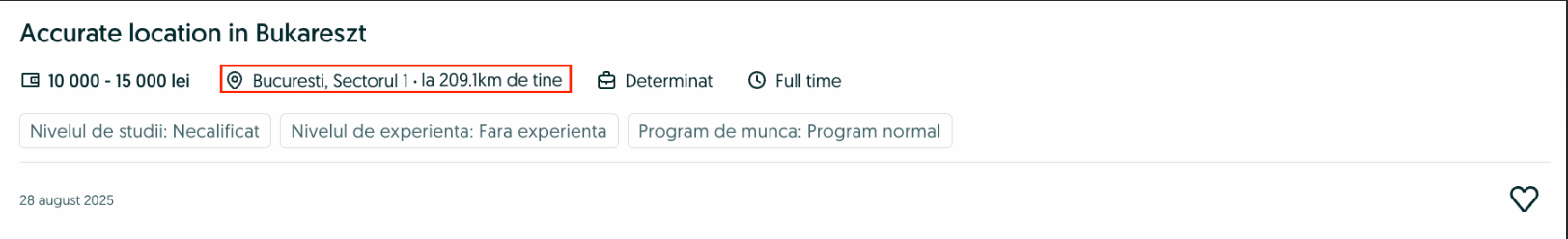 Un exemplu de modul în care este afișată distanța de la locația curentă a solicitantului până la locul de muncă pentru postul vacant: